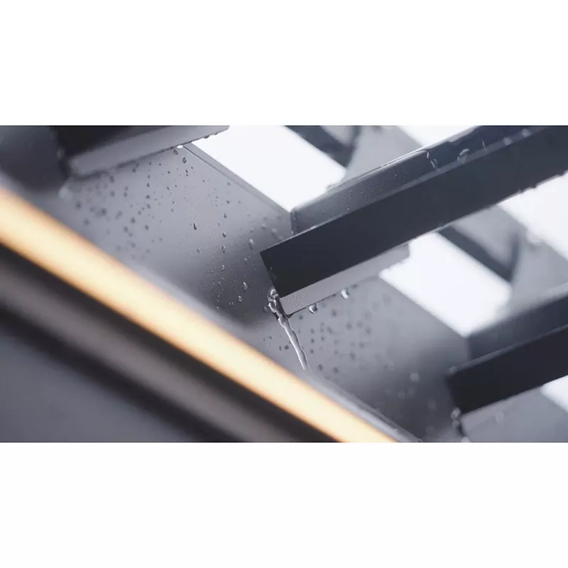 루버를 닫으면 완전한 방수 구조를 형성합니다. 빗물은 루버의 가장자리를 통해 가로보로 흘러 들어간 다음 기둥에 설치된 배수 채널로 흘러 들어가 최종적으로지면으로 배수되어 표면 축적을 방지합니다.